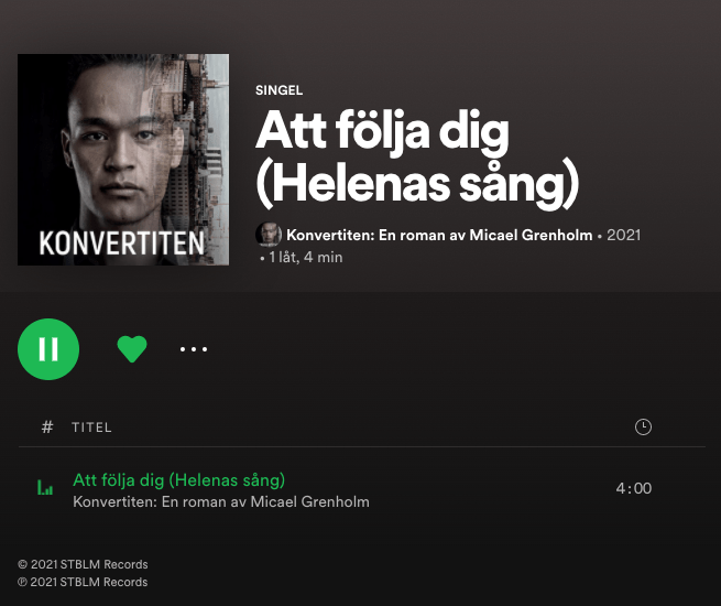 Den 12 november 2021 släpptes låten Att följa dig (Helenas sång) på Spotify och andra musikplattformar. Sången är skriven och framförd av Liselotte Östblom och skrevs på begäran av Micael Grenholm när han jobbade med bokmanuset till Konvertiten.